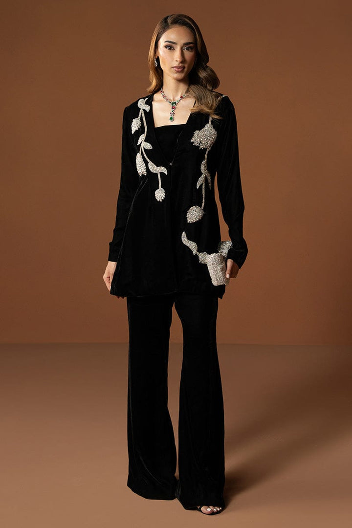 A jet-black velvet short jacket is adorned with gleaming silver floral embroidery, creating a radiant dance of light and texture. Paired with graceful boot-cut pants, Ophira strikes a perfect harmony between modern and classy elegance.