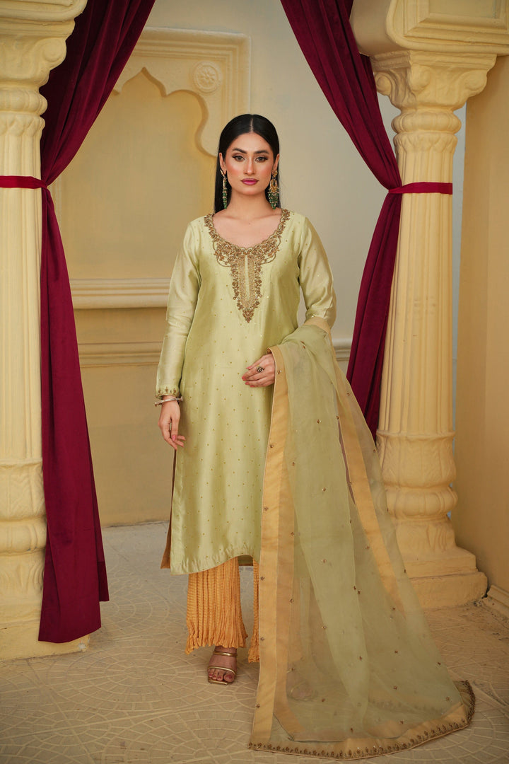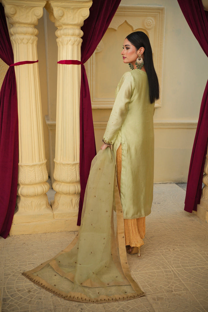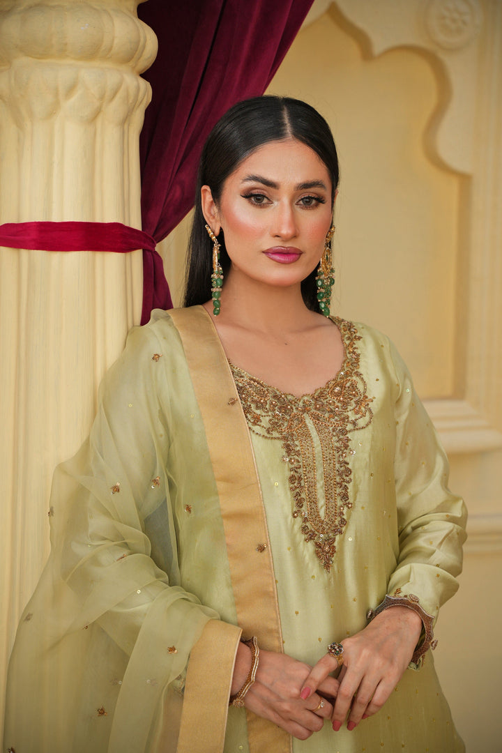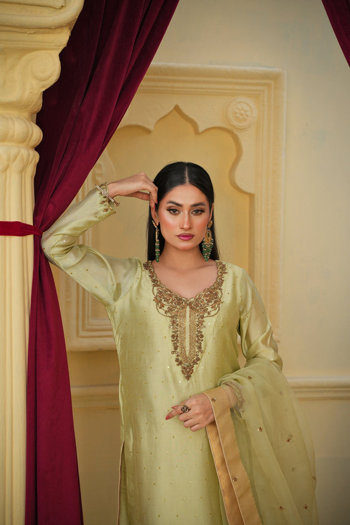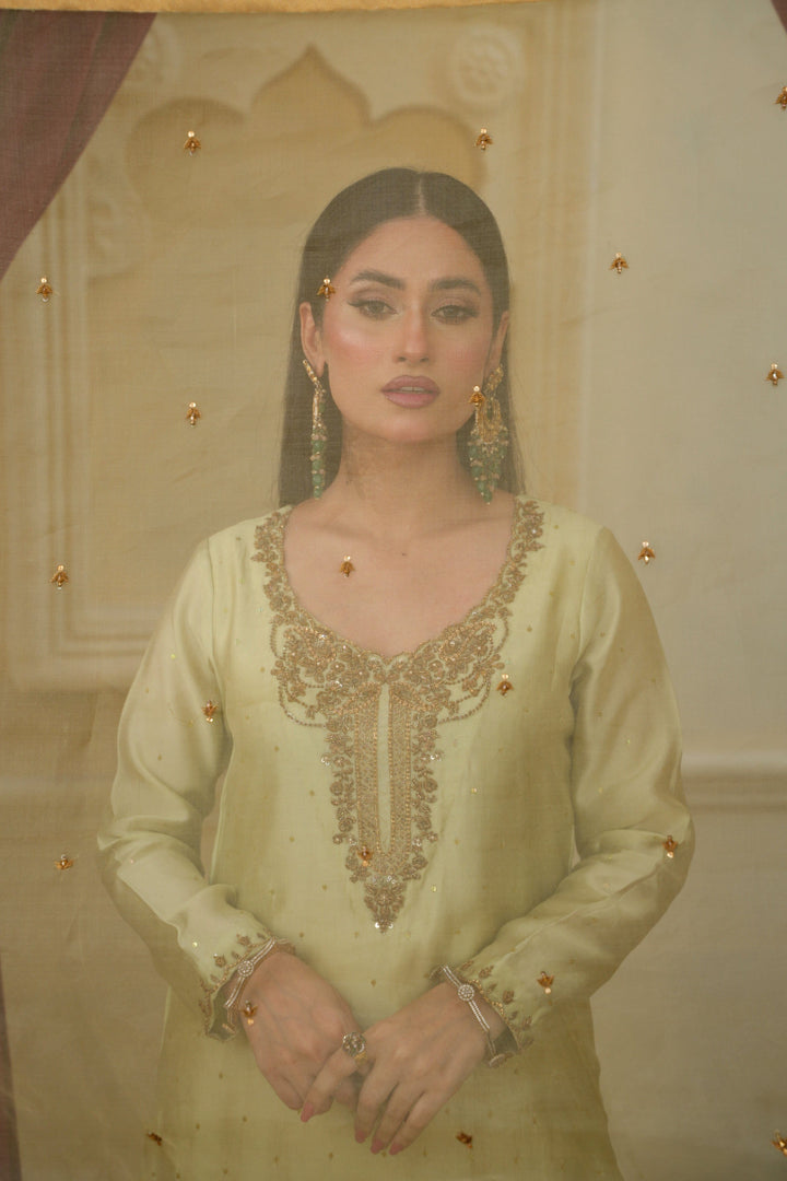 The Lama Silk shirt exudes a regal sheen and elegant fall, paired with crushed gold Pakistani Raw Silk trousers that add a graceful contrast and festive allure. Completing the look is a delicate Organza dupatta, adding a soft, ethereal touch to the ensemble.
