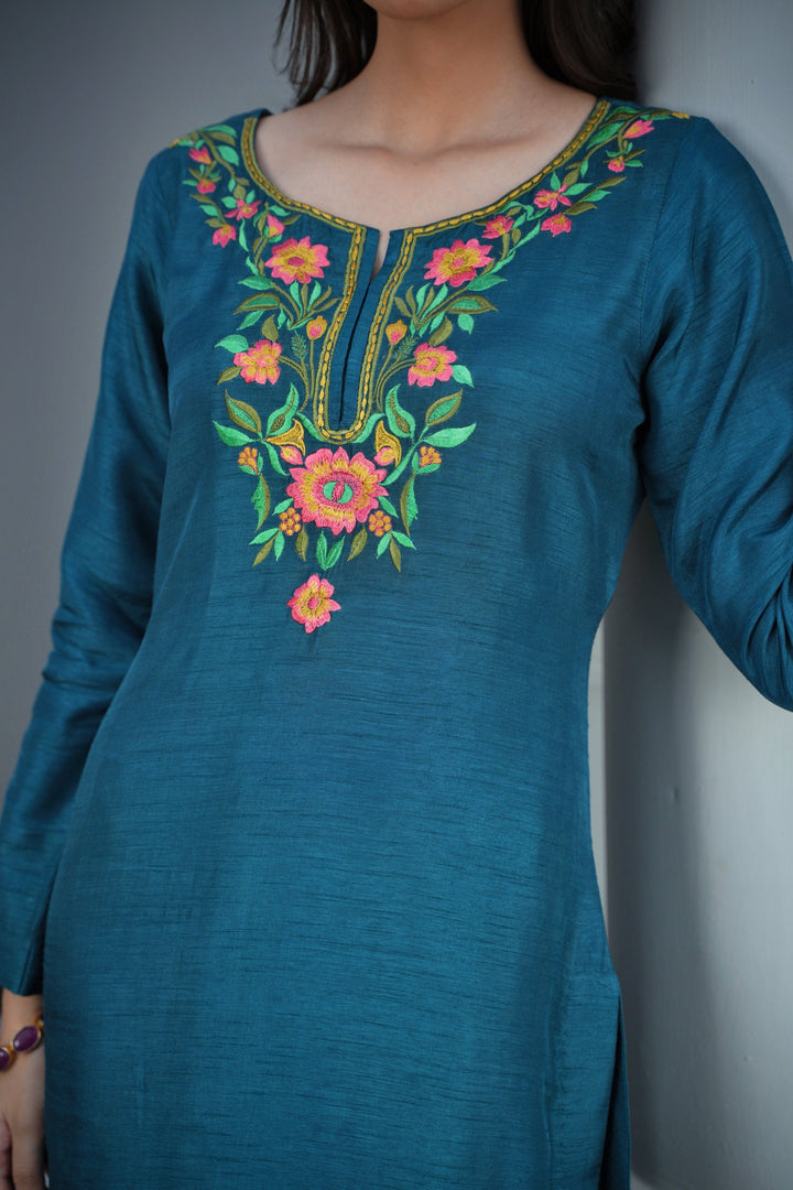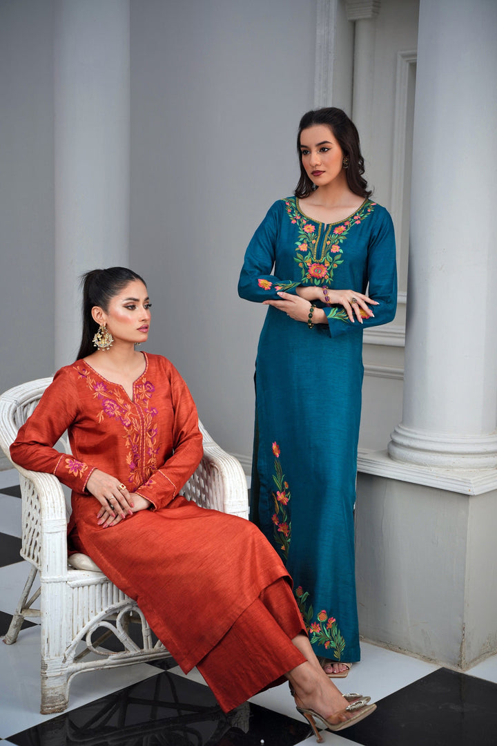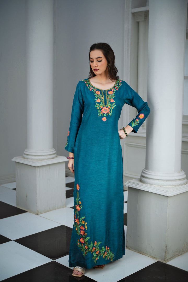 Adorned with delicate silk thread embellishments, this exquisite Teal Jardin Kaftan is crafted from luxurious Korean Raw Silk, radiating effortless grace and sophistication. The rich teal hue adds a touch of regal charm, while the fluid silhouette ensures timeless elegance and comfort.