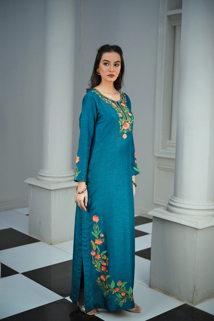Perfect for festive gatherings, formal occasions, or evening soirées, this Teal Jardin formal kaftan captures the essence of ethnic luxury.