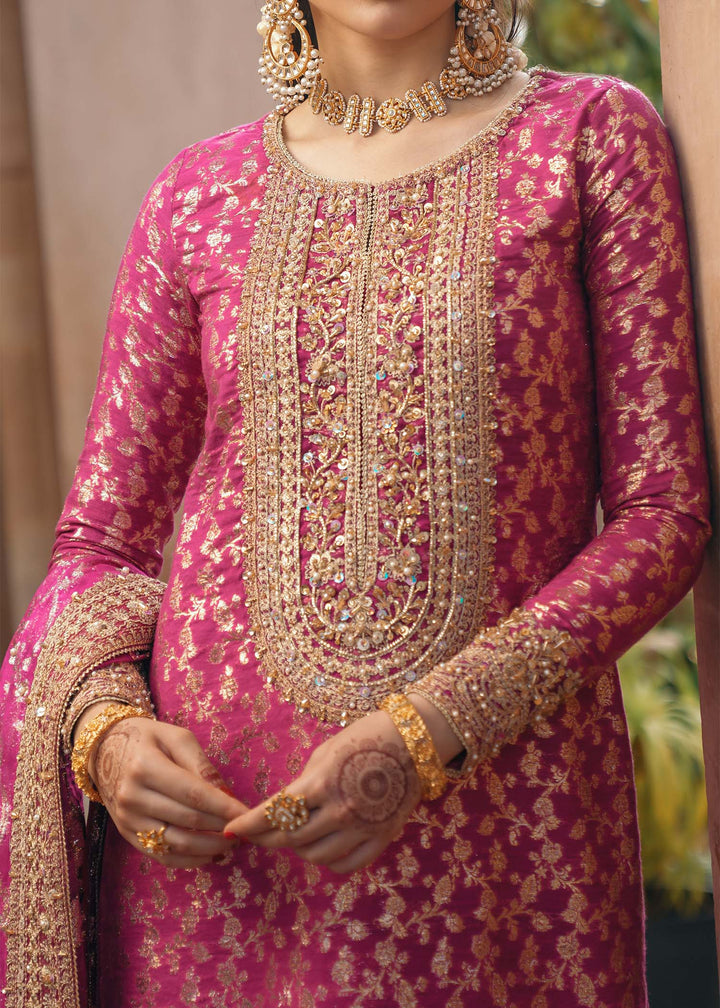 Vibrant and striking, this Shocking Pink Badla Set is designed to turn heads. The shirt is crafted from shimmering badla fabric, featuring a hand-embroidered neckline that adds artisanal charm and intricate detail. It’s paired with Korean silk pants, finished with gota lace for a touch of tradition and sparkle. The look is tied together with a matching badla dupatta, creating a cohesive and festive ensemble—perfect for mehndis, dholkis, or any celebration where bold color and fine craftsmanship take center stage.