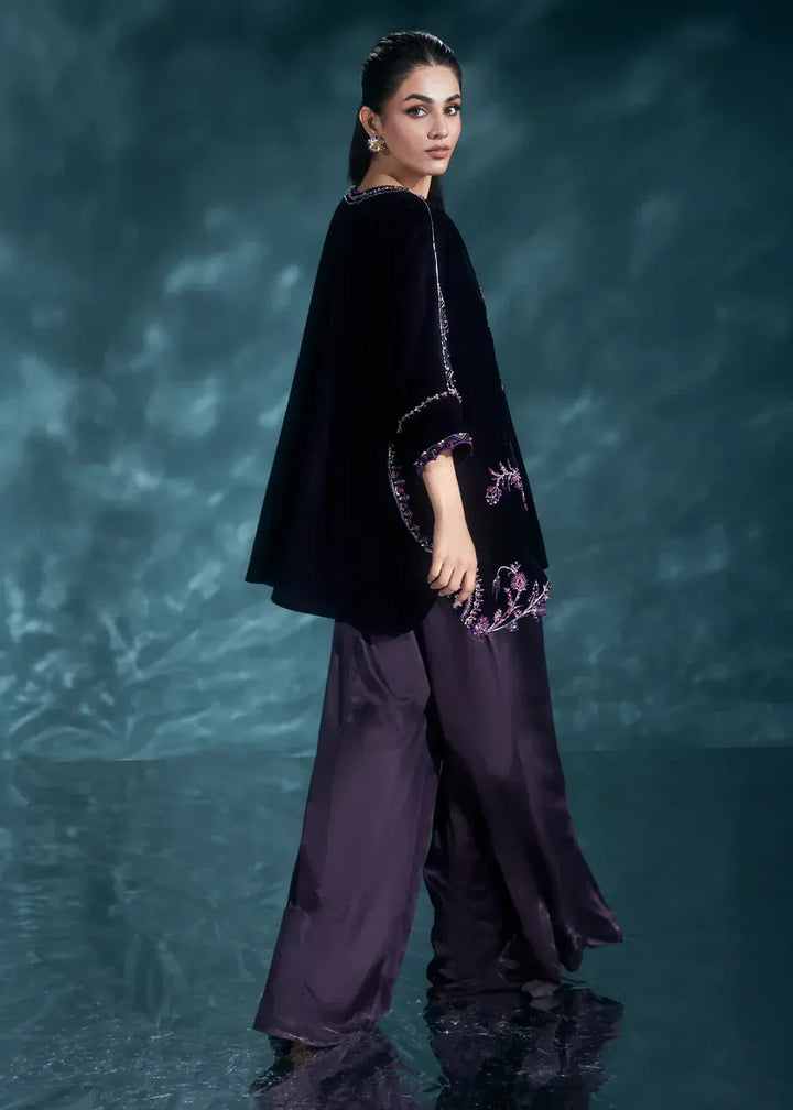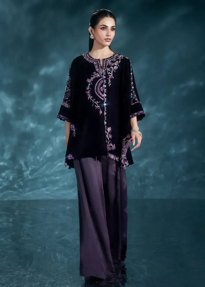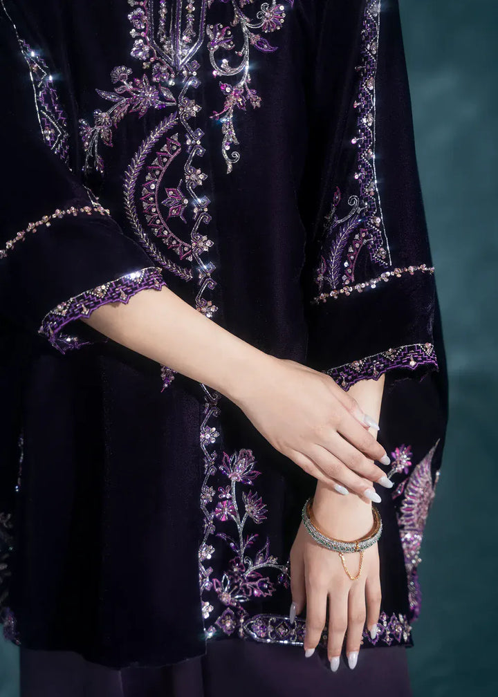 Explore the timeless glamour of this purple hued velvet. In Regal an embellished neckline makes way for a short jacket style shirt and a cascading velvet silk pants, evoking an indulgent visual experience. The resham embroidery, sequence, cut daana, Swarovski, stone work adorns the entire shirt, elevated by abstract details.