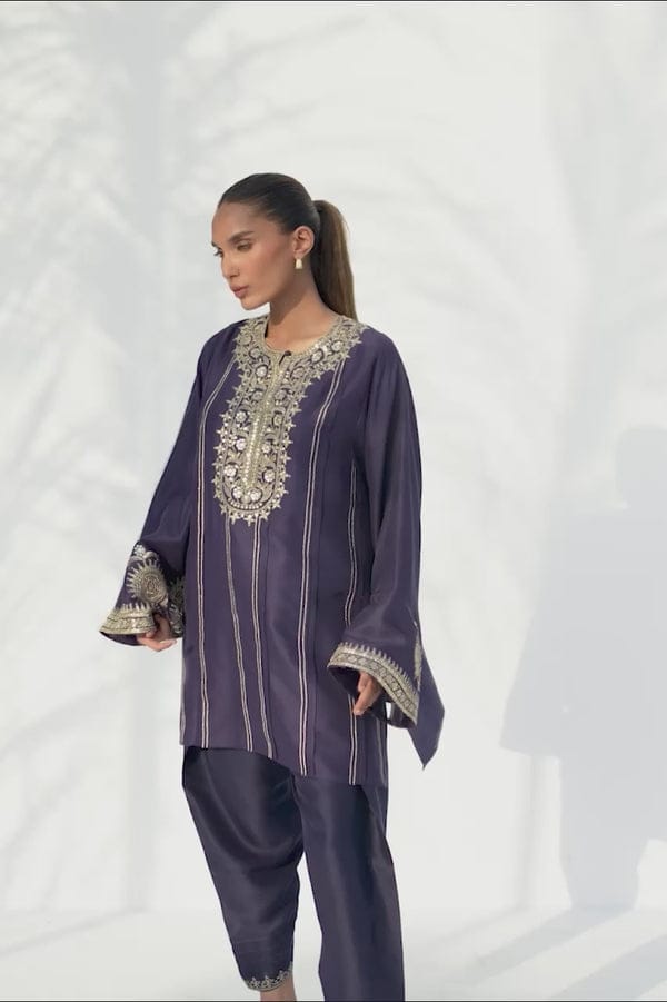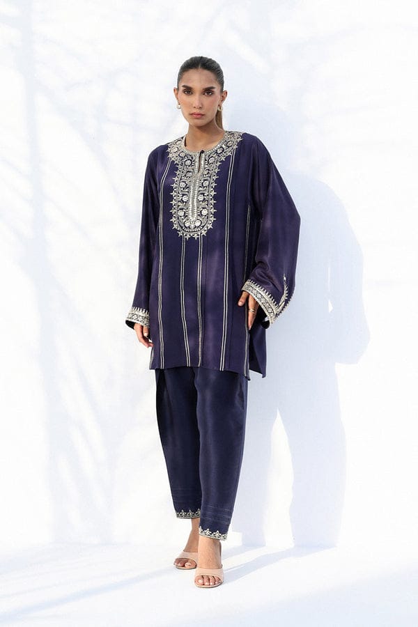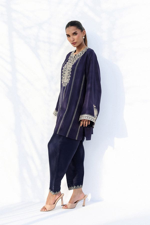 This deep midnight blue pure Raw Silk ensemble embodies refined traditional artistry. The relaxed shirt is adorned with gold and silver resham and sequin embroidery along the neckline and cuffs, while subtle vertical pinstripes add depth and texture. Paired with a matching shalwar, the look reinterprets classic festive wear with understated elegance.