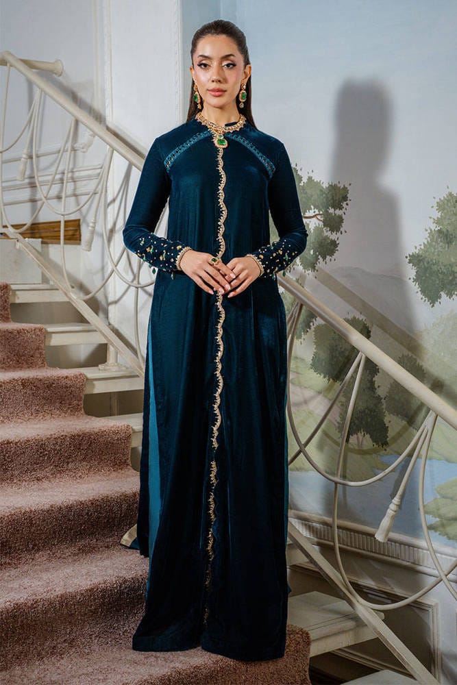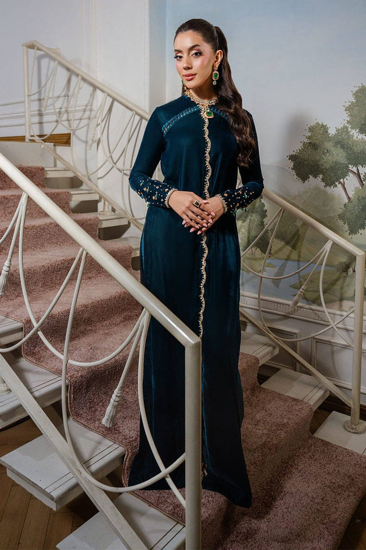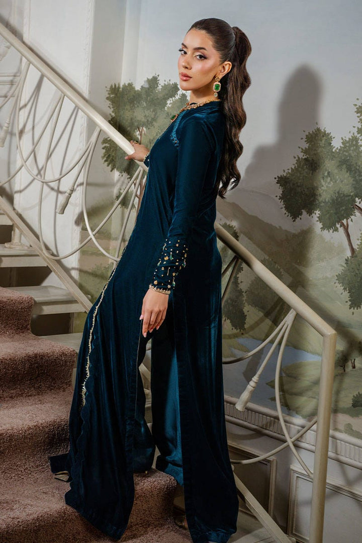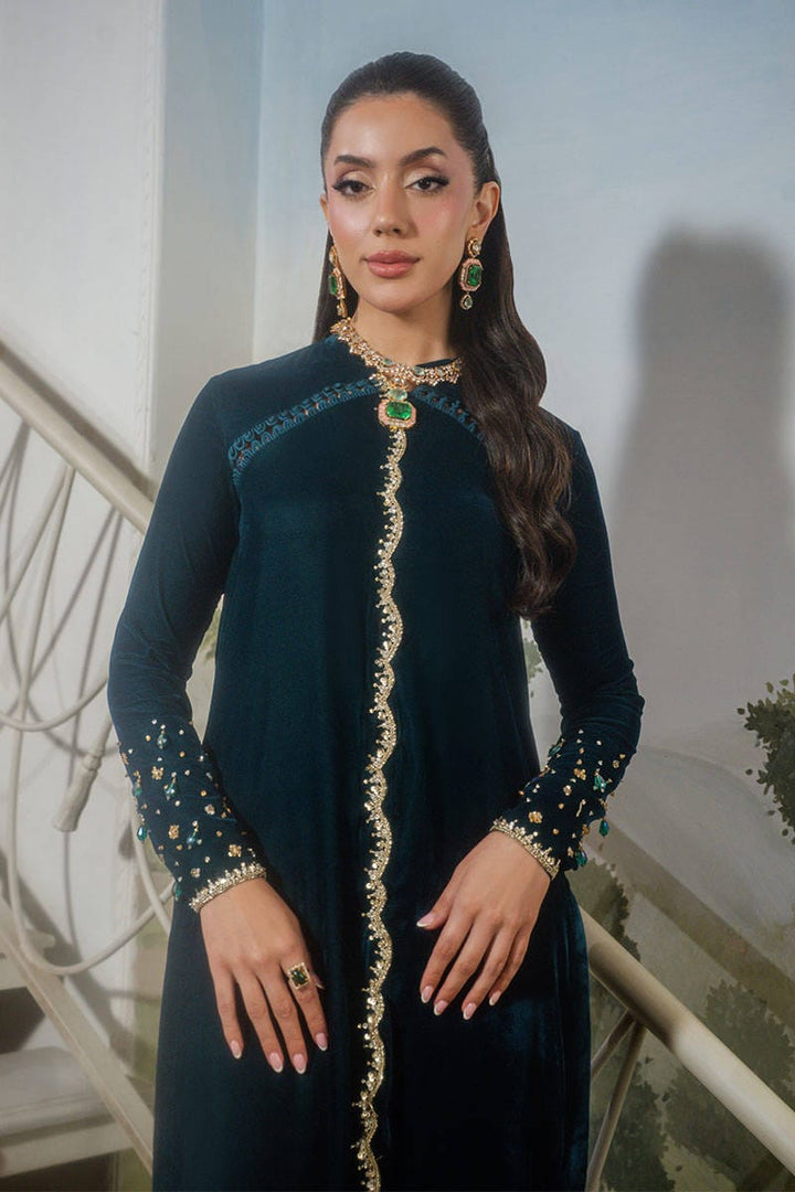 Rich Green is a striking ensemble in a stunning teal hue, adorned with intricate hand embellishments along the neckline and throughout the center of the shirt.The fitted sleeves feature crystal work and delicate hanging details that elevate the look, complemented by elegant loop accents on the neck. Paired with matching silk pants, this ensemble exudes sleek sophistication, a true head-turner for any occasion.