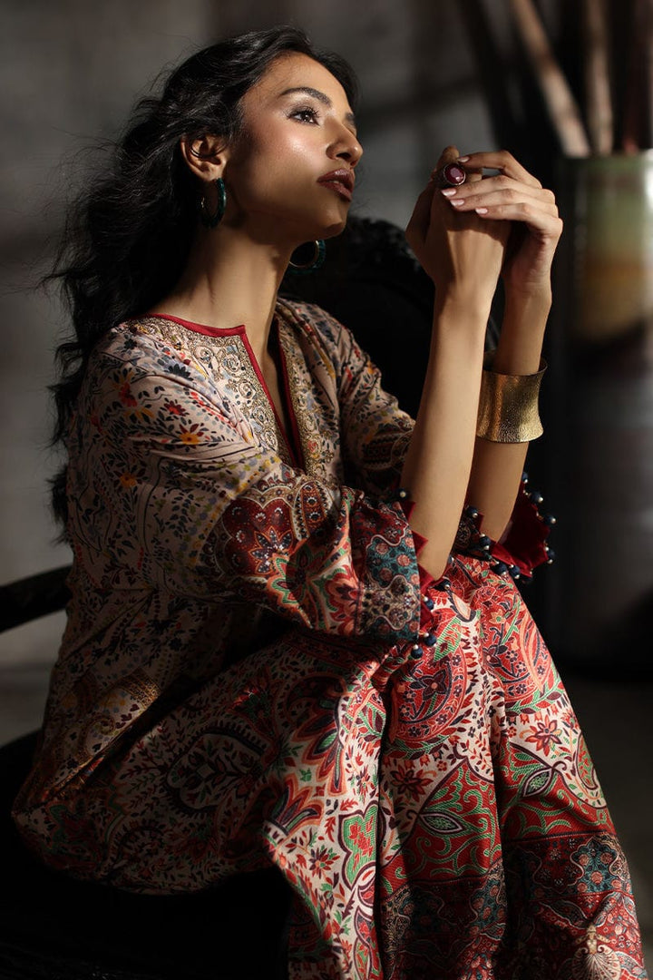 Crafted in soft velvet, this kaftan is defined by its vibrant multicolor pattern and lightly embroidered neckline, offering timeless charm with a modern touch.