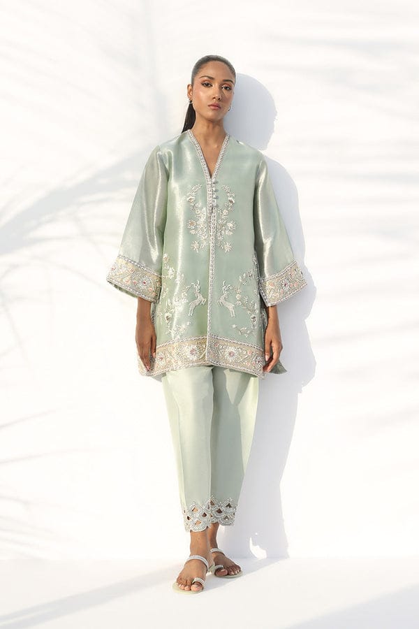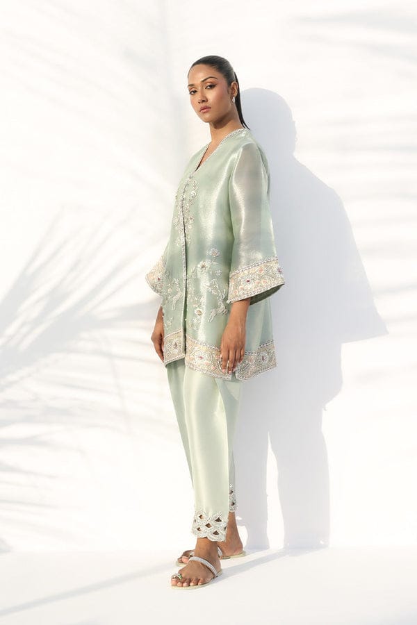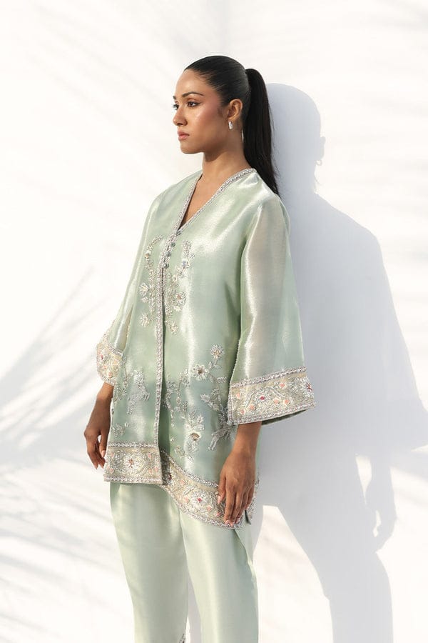 A serene aquamarine ensemble featuring a front open tissue kurta adorned with intricate zardoze embroidery in silver thread, pearls, and sequins that shimmer softly along the neckline, sleeves, and borders. The wide cuffs are richly embellished with appliqué and ornate detailing, adding a festive allure. Paired with a matching pure Raw Silk tube top and tapered shalwar finished with embroidered cutwork hems, the look exudes effortless grace and refined elegance.