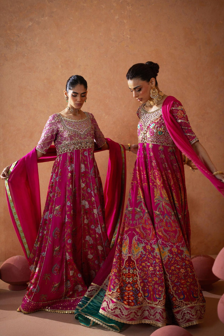 This floor-length pishwas is presented in an exquisite festive pink hue, showcasing a floral embroidered panel complemented by intricate gota embellishments. The lamé bodice has been meticulously designed with elaborate zardozi details. The center back of the bodice is adorned with handcrafted dangling tassels, adding to its elegance. The hem features a carefully curated border of light-catching sequins. The ensemble is completed with an ombré silk dupatta and straight raw silk pants, offering a sophisticated finish to the overall look.