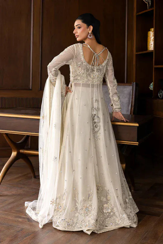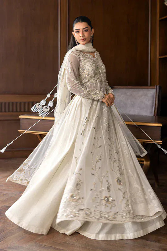 A graceful white french net floor-length shirt, intricately embellished with heavy embroidery that exudes timeless elegance. The design features full sleeves adorned with refined detailing and tassel hangings, adding a touch of charm and sophistication. It is paired with a classic raw silk plain lehenga for a clean and regal balance, along with a delicate net dupatta highlighted with scattered sequin work that shimmers softly. An ensemble that embodies purity, grace, and modern refinement perfect for statement occasions.