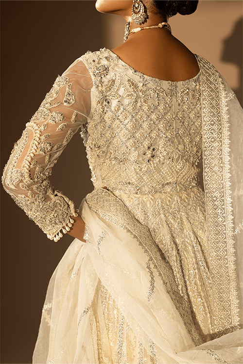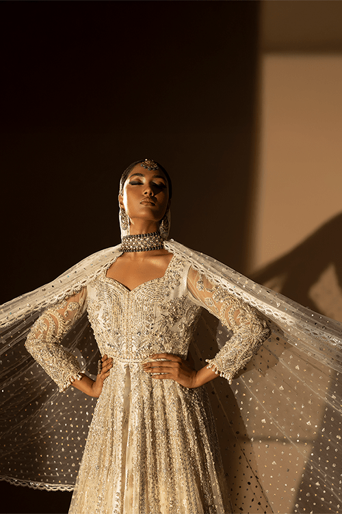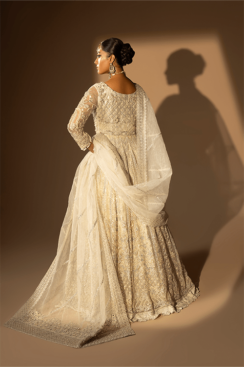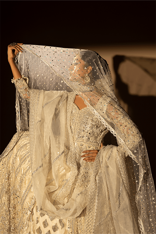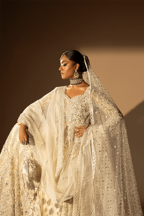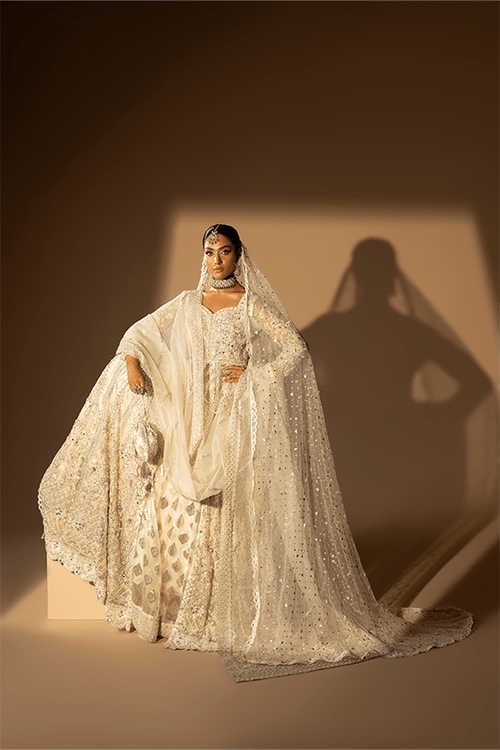 An elegant white lehnga made in breezy net, paired with a zari booti organza lehnga and a delicate organza dupatta. The shirt is adorned with exquisite machine embroidery and intricate handwork using beads, stones, pearls, stars, gota, dabka and naqshi, creating a look that blends grace with grandeur.