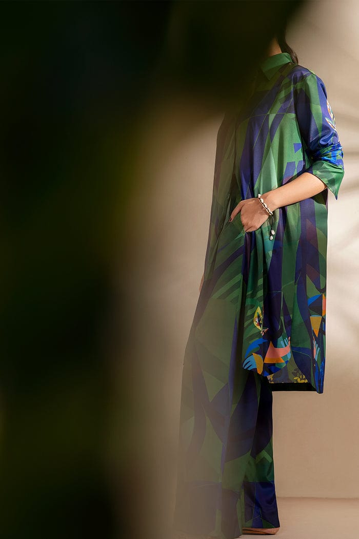 An ode to emerald depths, Forêt Luxe is where geometry meets bloom. Cut in premium silk, the long-line tunic flows effortlessly into wide-leg trousers, both rendered in layered shades of green and indigo. Subtle diamond-like geometry shapes the base, while abstract floral accents at the hem add a painterly flourish. Structured yet fluid, modern yet timeless — this is silk dressing elevated for evenings of quiet power and refined presence.