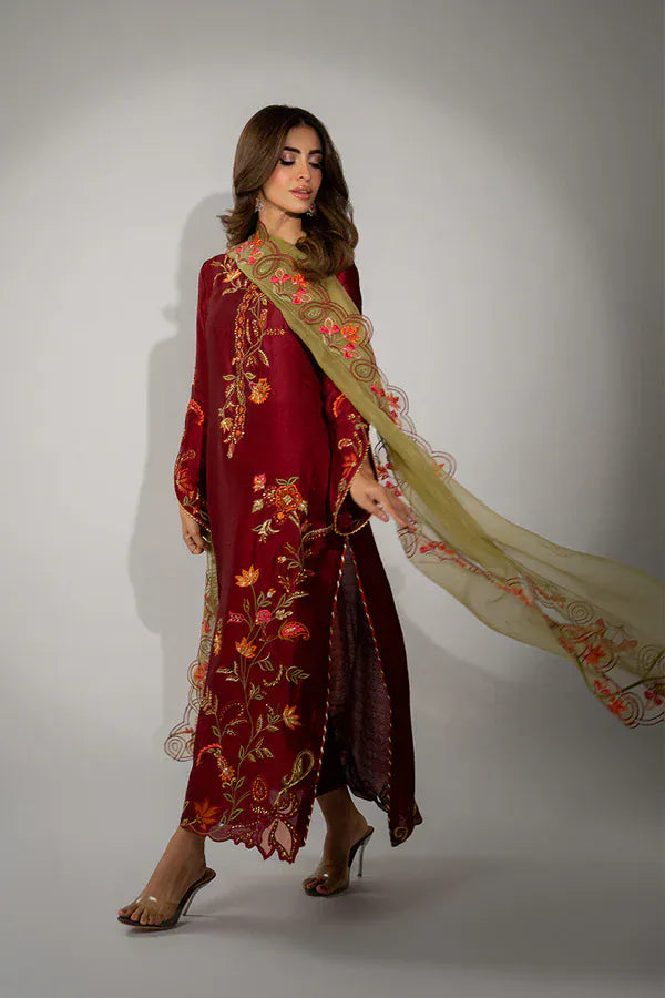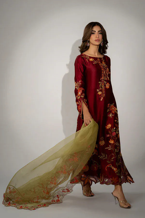 Illuminate your festive occasions with this stunning red-maroon sheesha silk ensemble, showcasing the timeless beauty of Mina Hasan's signature craftsmanship. The long, elegant kurta is adorned with vibrant floral embroidery in tones of orange, pink, and olive, gracefully trailing from the shoulder down the length of the shirt and sleeves. This striking piece is completed with a contrasting moss-green dupatta, featuring a scalloped border intricately embellished with matching floral embroidery to perfectly capture the essence of luxurious elegance.