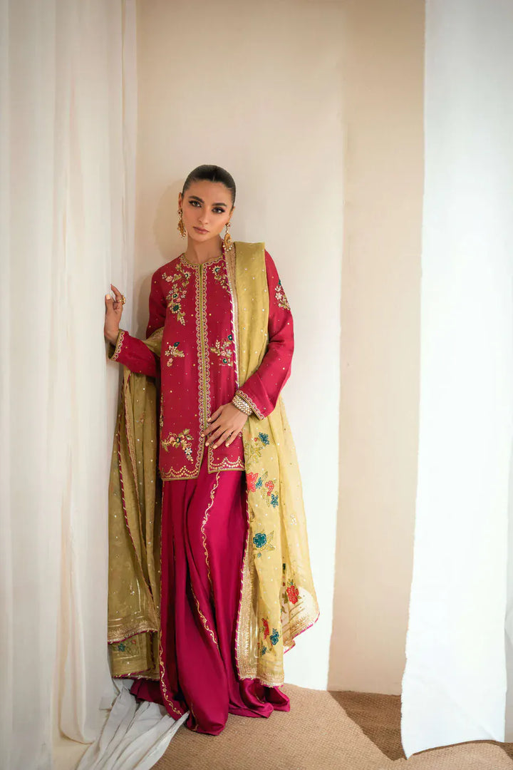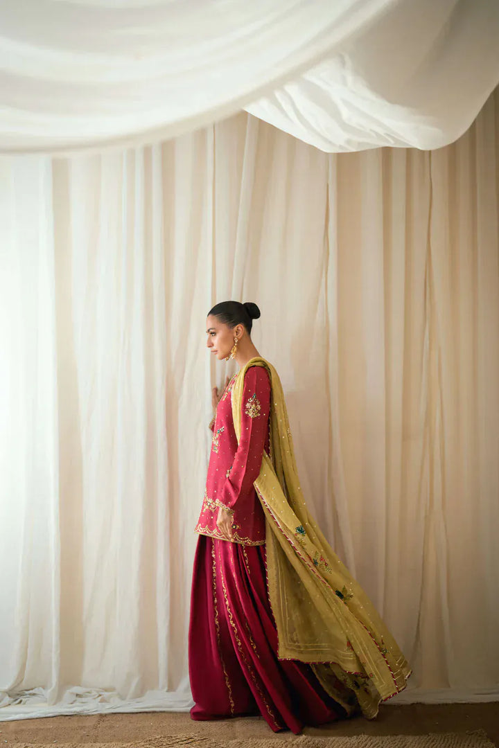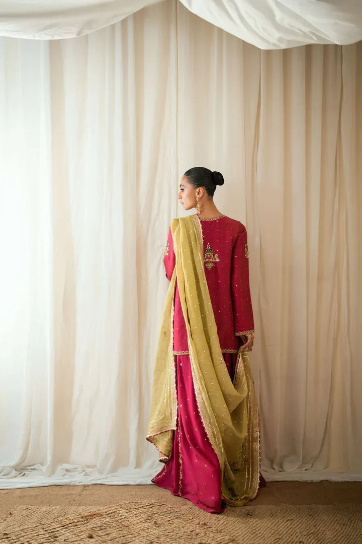 This ensemble blooms an opulent jacket style shirt in a gorgeous shade of cherry red, cut in pure raw silk, enhnacing intricate resham embroidery edged with zardozi, further beautified with gold Mukesh spray.It is paired with embellished silk flappers adding a luxury touch along side a contrasting mesuri duppatta delicately hand painted and embellished to make it an unforgettable silhouette