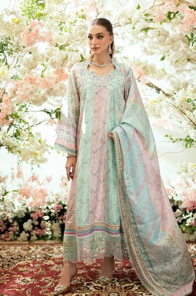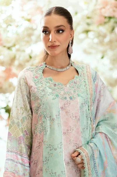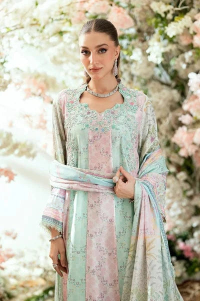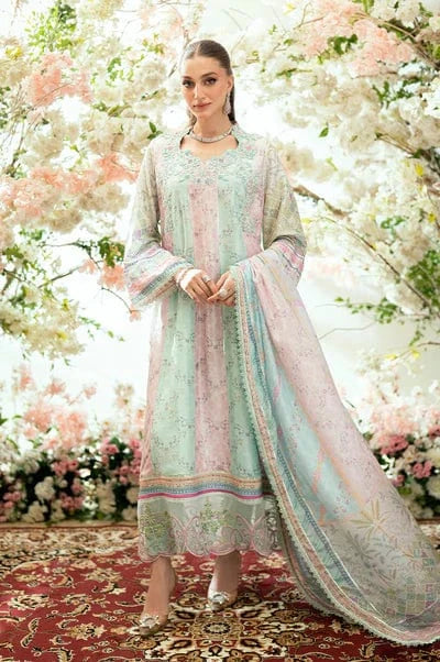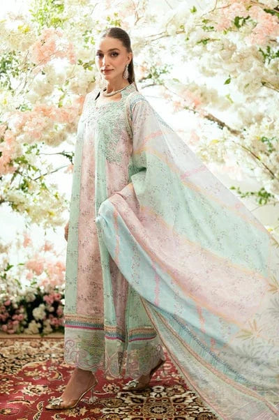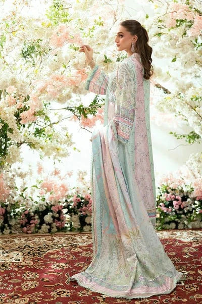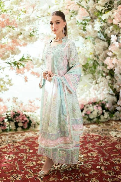 Step into a dreamy fusion of color and craftsmanship with this breathtaking kalidaar in dual tones of sky blue and blush pink—a fresh interpretation of elegance rooted in tradition. The flowing silhouette is anchored by a heavily embellished neckline, brought to life with exquisite handwork featuring sequins and intricate kacha resham embroidery, showcasing impeccable artisanal finesse. Each panel of the kalidaar flows seamlessly into the next, while a finely embroidered border adds depth and structure to the hem. The look is elevated with a printed silk dupatta, adorned with charming palm tree motifs and contrasting tones, offering a playful yet refined touch. Paired with a tailored raw silk trouser, this ensemble is a symphony of texture, color, and craftsmanship—perfect for festive soirées and celebrations where making a statement is simply effortless.