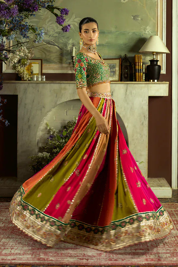 Step into timeless elegance with this pure raw silk blouse in a deep, regal green, brought to life through intricate hand embroidery blending floral and geometric motifs. Delicately crafted tassels cascade along the bodice, adding graceful movement, while statement tassels at the back lend a playful yet sophisticated charm. The blouse is paired with a charmeuse silk lehenga, featuring a vibrant medley of colors and artistic patterns that swirl across the fabric like brushstrokes. A meticulously finished border outlines the hem, adding a refined structure to the fluid silhouette. Completing the ensemble is a zari organza dupatta, designed in a bold contrast of orange and green. It glows with delicate sequin work scattered throughout, and a beautifully finished border that adds definition and sparkle—perfectly tying together tradition and contemporary flair.