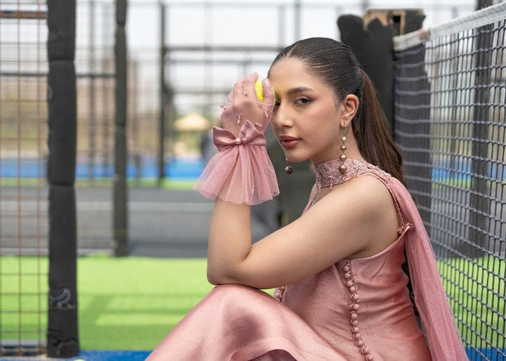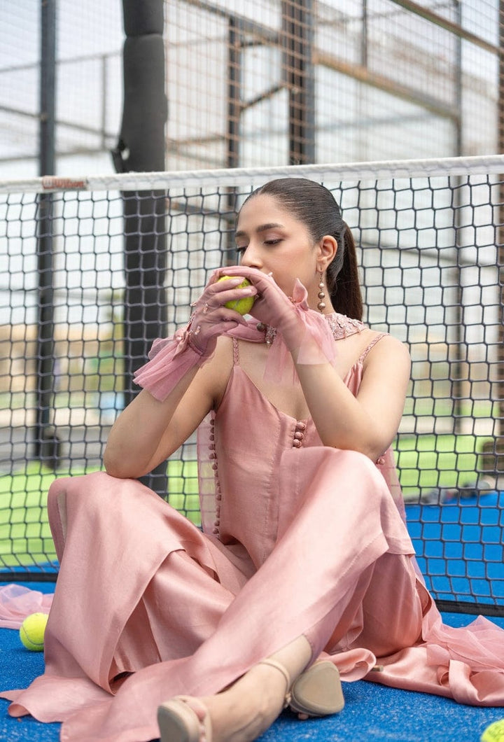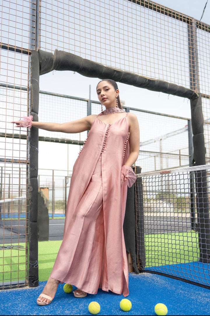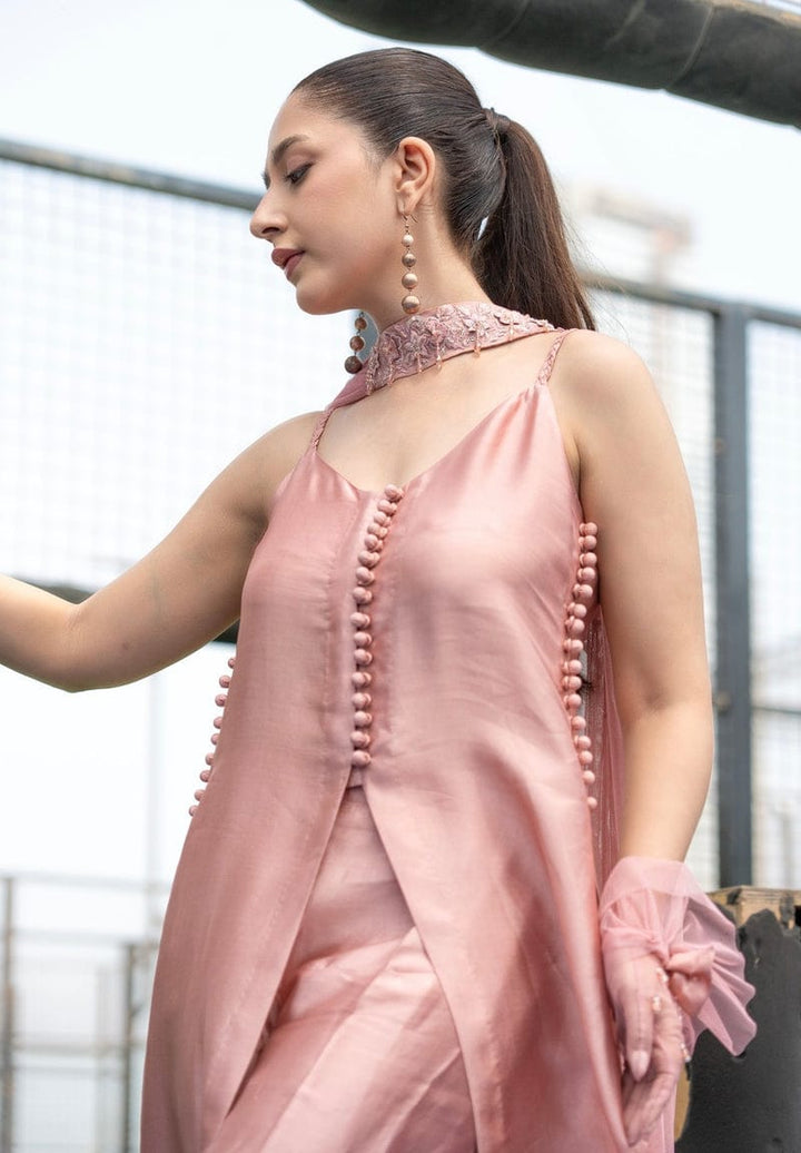 Trendy angarkha style shirt with front open paired with comfortable silken azear and a matching korean net neckpiece.