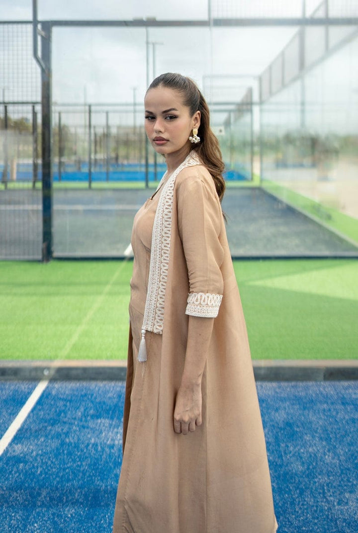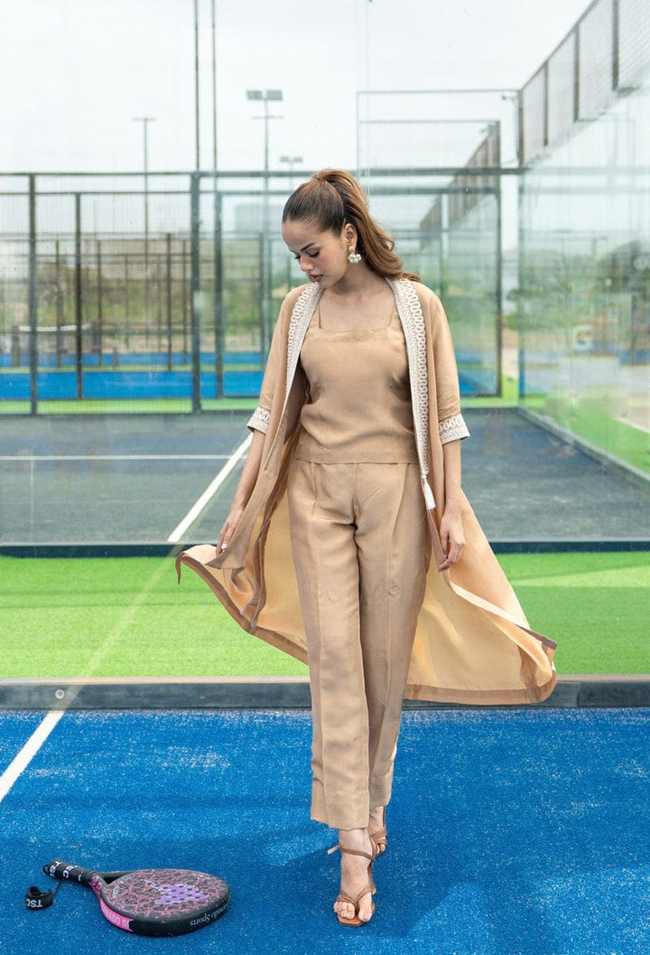 This modern beige cape designed with elegant dori work along the collar and motif detailing at the back. Paired with a slip and straight pants, perfect for festive and casual occasions!