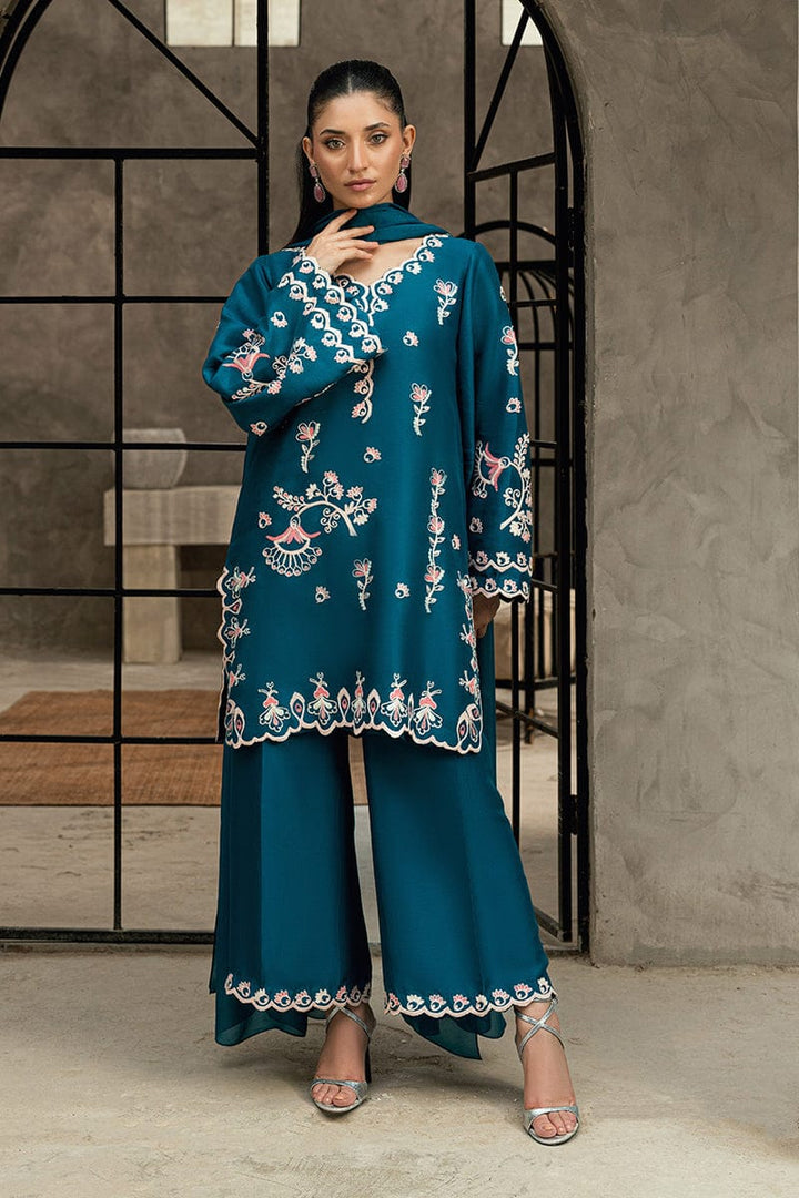 In rich teal raw silk, this short shirt is adorned with intricate multicolored Ari embroidery that enhances its luxurious appeal. Scalloped edges along the hem and sleeves add a graceful, feminine touch, while a plain silk dupatta lends understated sophistication. Paired with tailored raw silk izzar pants, the ensemble strikes the perfect balance between timeless charm and contemporary poise.