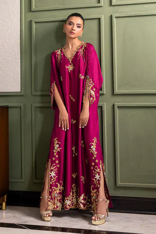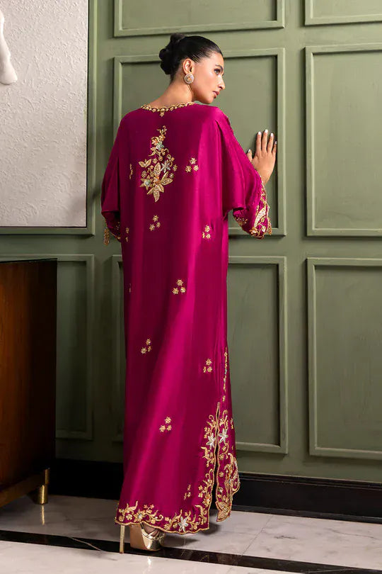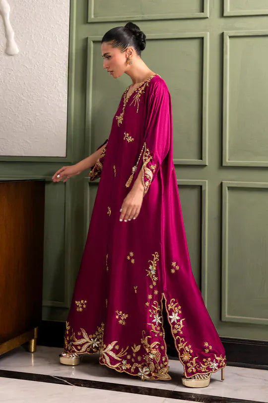 A striking magenta raw silk kaftan, richly adorned with intricate embroidery that flows seamlessly across the silhouette. The design features a heavily embellished neckline that draws the eye with regal detail, while the sleeves are finished with ornate borders for a balanced touch of sophistication. Crafted to embody both elegance and comfort, this kaftan radiates effortless grandeur, making it an exquisite choice for festive and formal occasions.