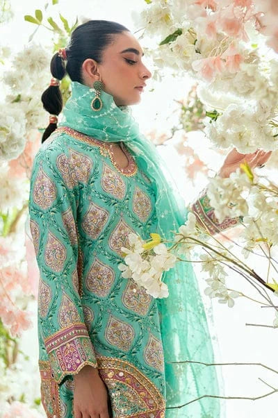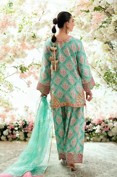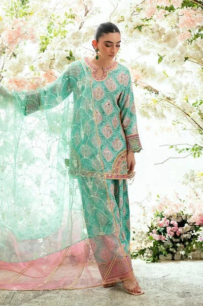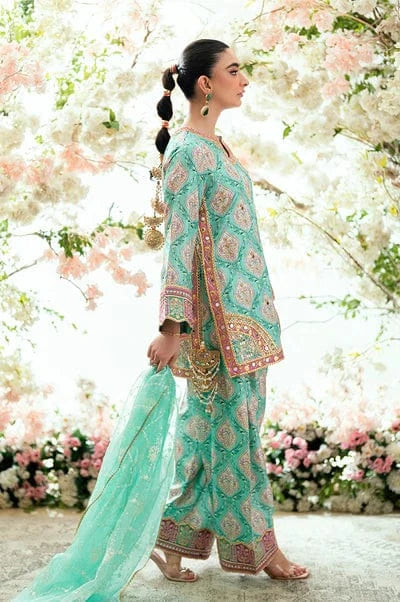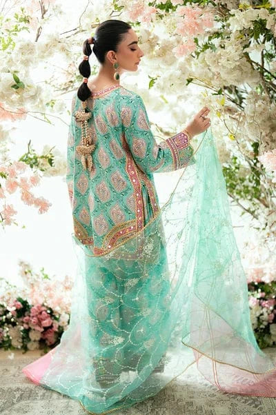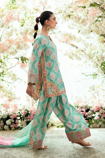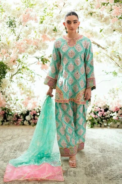 Channeling old-world charm with a contemporary twist, this stunning Tiffany-colored ensemble by Sarah Sheeraz captures the essence of traditional luxury. The short shirt and farshi shalwar are adorned with intricate pink appliqué and heavy gota work, complemented by exquisite hand embellishments that reflect signature attention to detail and timeless aesthetic. Paired with an embroidered organza dupatta and a contrasting pallu , this look radiates elegance and cultural richness—perfect for making a lasting impression at festive gatherings and formal occasions.