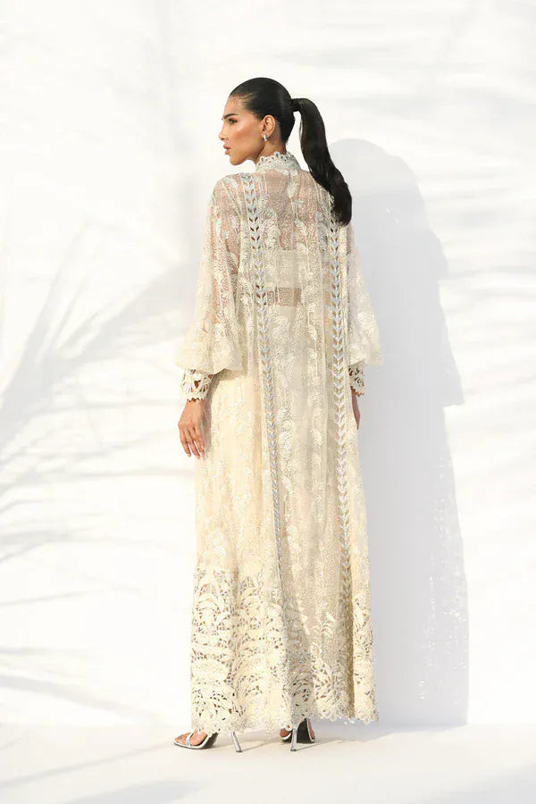 An ethereal ivory ensemble that captures modern romance through intricate craftsmanship. The cascading sheer tulle jacket is adorned with delicate floral embroidery, pearl accents, and scalloped edges, while eyelet details trace the front and hem with graceful precision. A scalloped high neck and bishop sleeves evoke a hint of vintage charm, complemented by a ruched tulle tube top and a draped charmeuse shalwar that lend subtle structure to the fluid silhouette.
