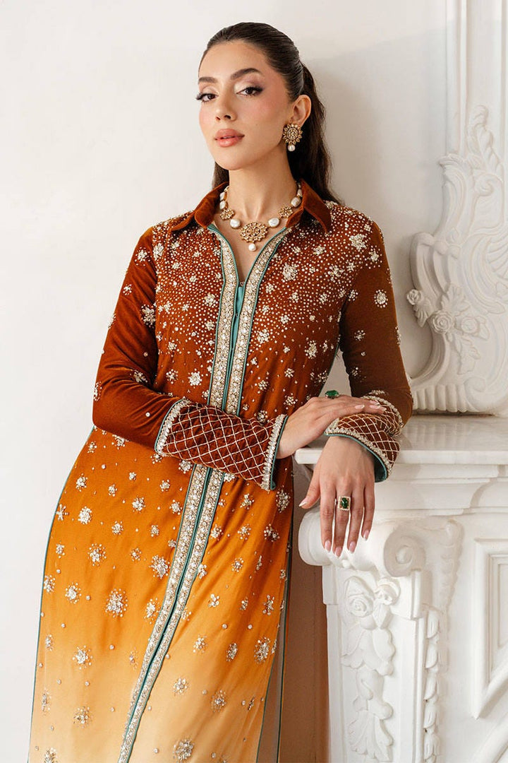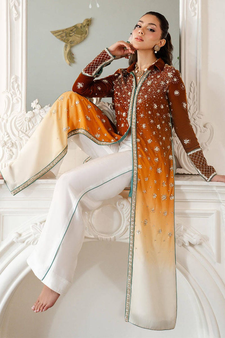 Twilight Ombré is a breathtaking jacket adorned with intricate hand embellishments throughout, featuring modern fitted sleeves that add a contemporary edge to its timeless allure. Paired with white flared pants, this ensemble strikes the perfect balance between sophistication and modern elegance.