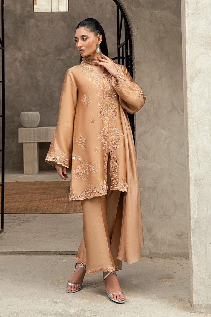 Tailored from rich brown masoori silk, this front slit short shirt is adorned with exquisite, multi‑style embroidery and hand work that blends elegance with intricate artistry. The ensemble is paired with matching straight masoori silk pants, beautifully finished for a refined touch, and a plain silk dupatta that adds understated grace. A perfect balance of contemporary silhouette and timeless sophistication.