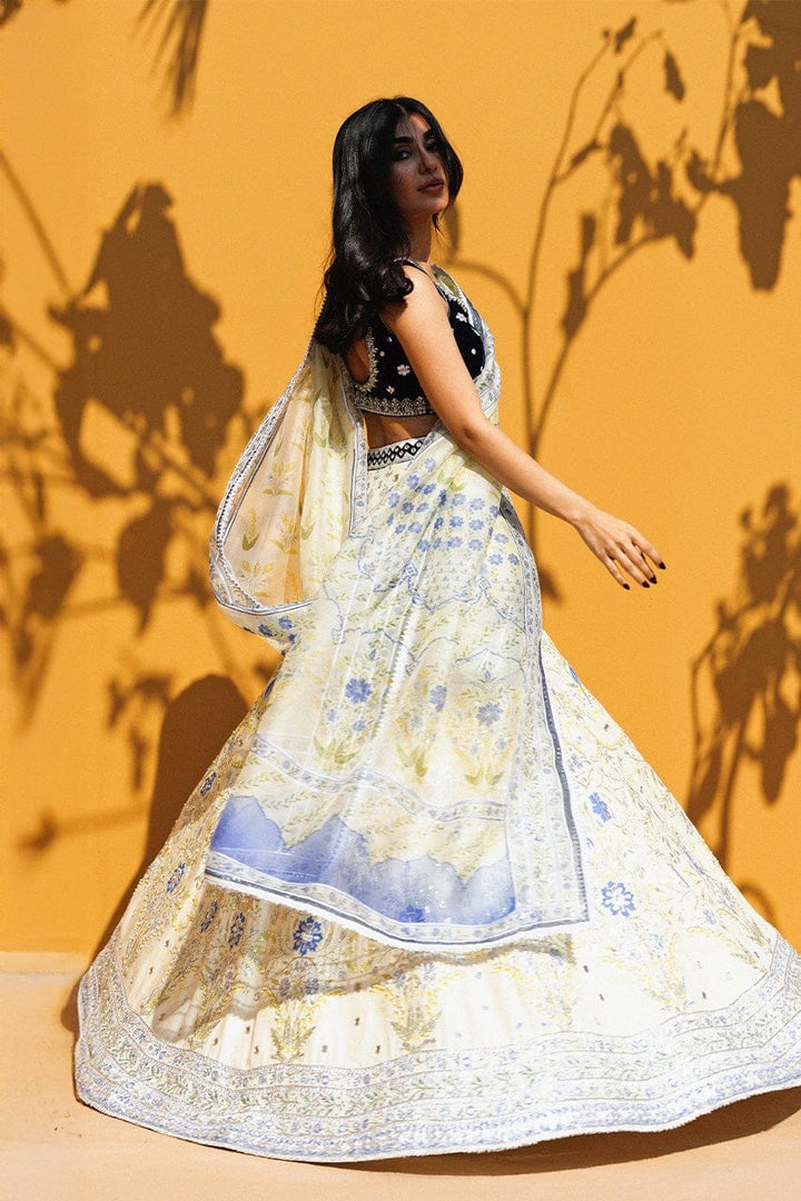 A striking ensemble pairs a midnight blue velvet choli with intricate zardoze and gota embellishment. The plush choli is balanced by the radiance of a pale cream hued lehnga, detailed with shimmering silver zardoze and gota embroidery and touches of periwinkle and lime florals that create cascading botanical latticework that finishes in a richly worked border. A pre draped organza dupatta completes the look, elevated with gota work and delicate edging, and a jeweled peacock brooch adds a refined touch to the waistband of the lehnga for a polished silhouette.