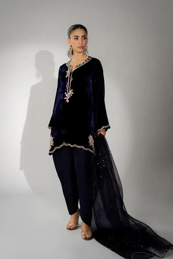 Draped in the deep, luxurious texture of midnight blue velvet, this chic ensemble is the ultimate statement of winter elegance and opulence. The short, flowing kurta is adorned with delicate silver dabka and crystal work, which beautifully frames the neckline and adds a subtle sparkle to the hemline. Paired with coordinating silk shalwar trousers and a sheer black dupatta featuring scattered sequin chhan, this look offers refined sophistication for evening and festive wear.