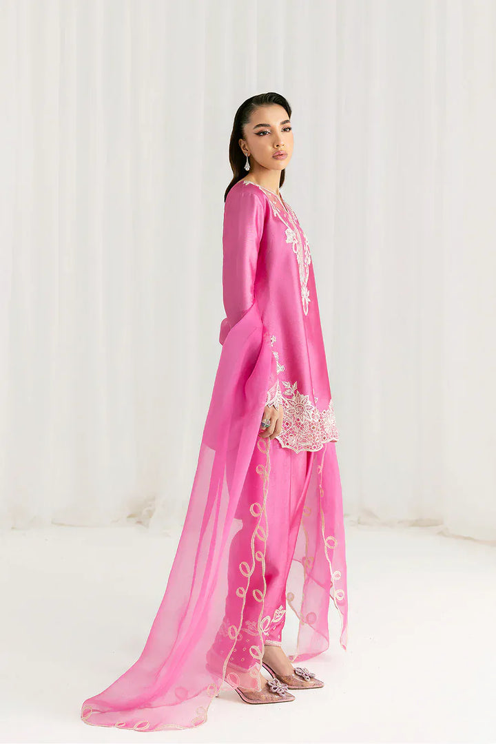 Gracefully elegant, this three-piece ensemble showcases a pink base adorned with delicate floral embroidery in a subtle yet premium silk, paired with a finely soft organza dupatta.