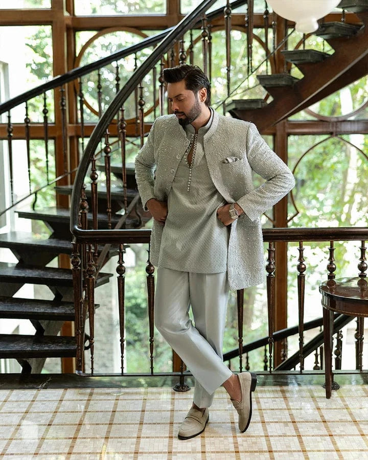 Description: Harnessing understated elegance, Wayez highlights ornate craftsmanship. Cut from an iced blue self jamawar, the short sherwani is elevated using dabka and kora stitches. This set includes a Karandi shirt and pure raw silk trouser, adding the perfect finishing touches to your look.