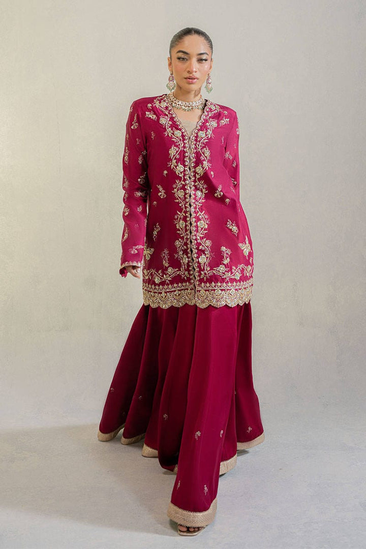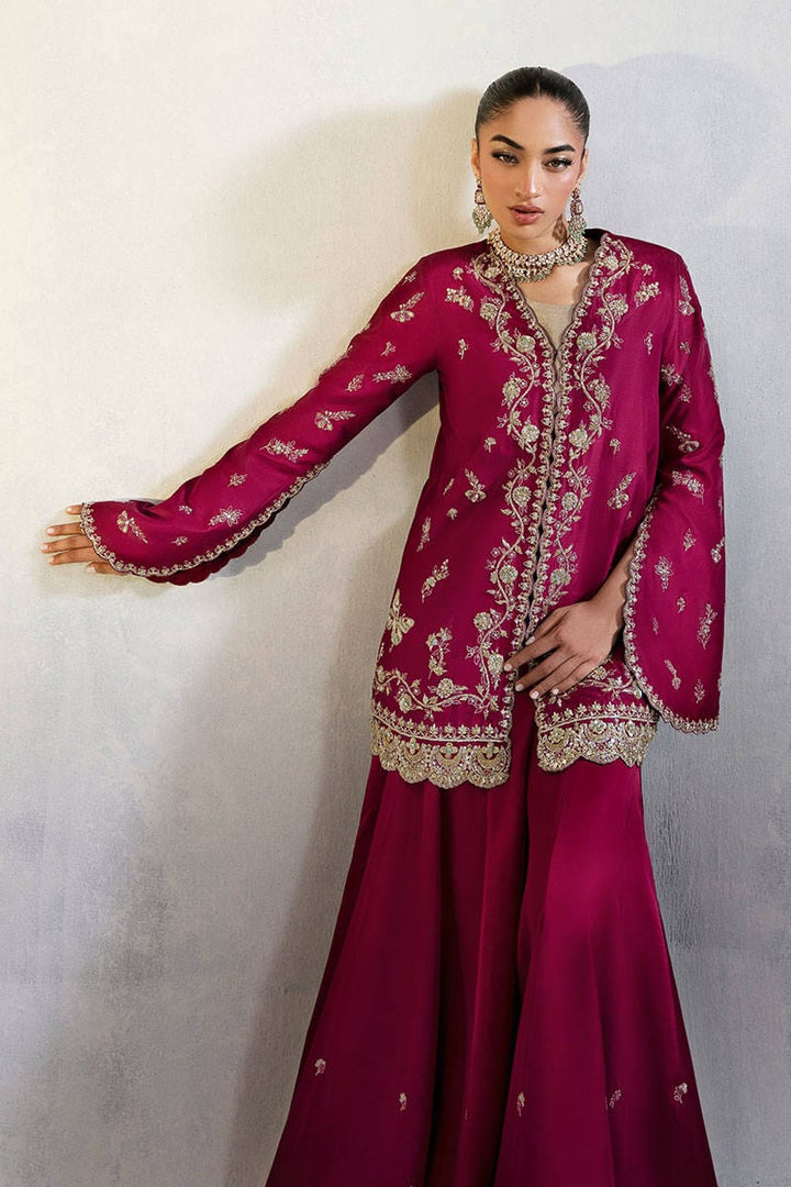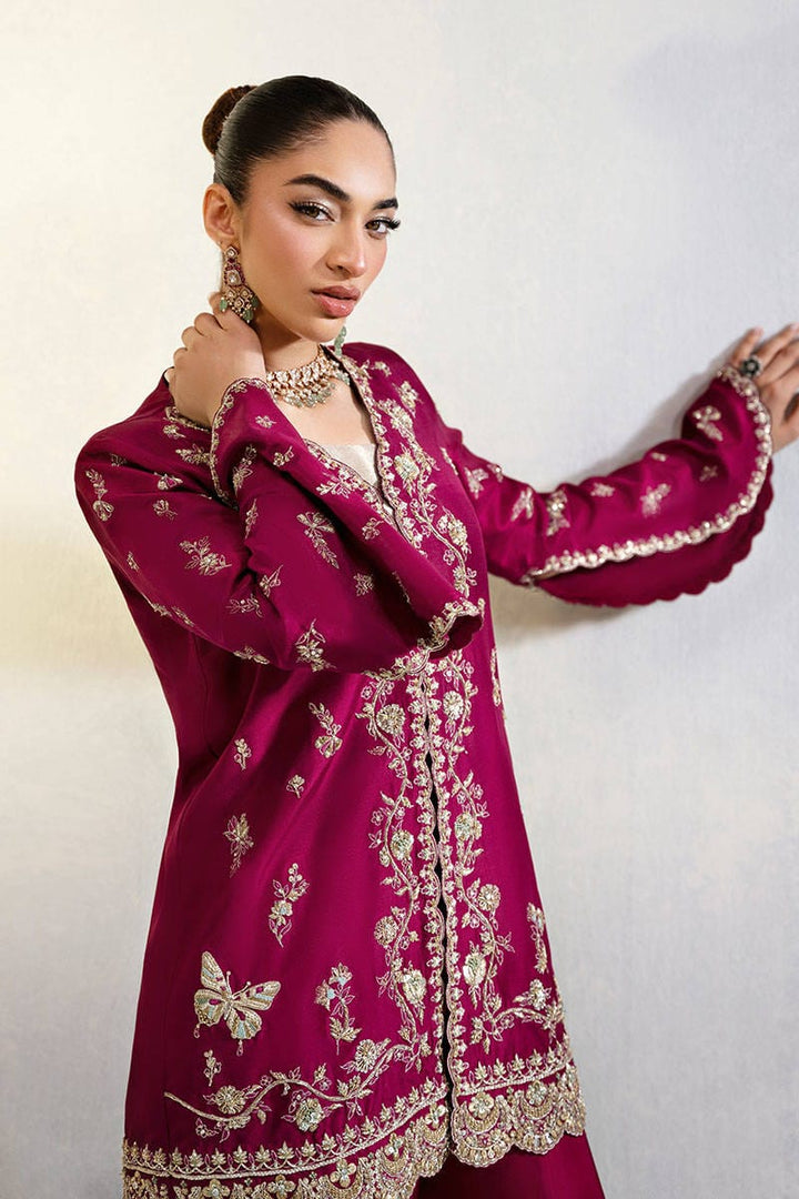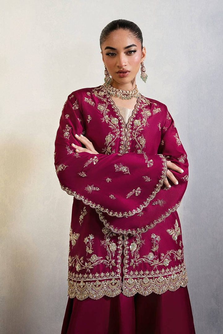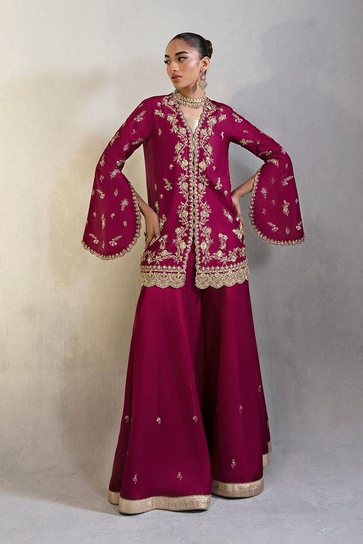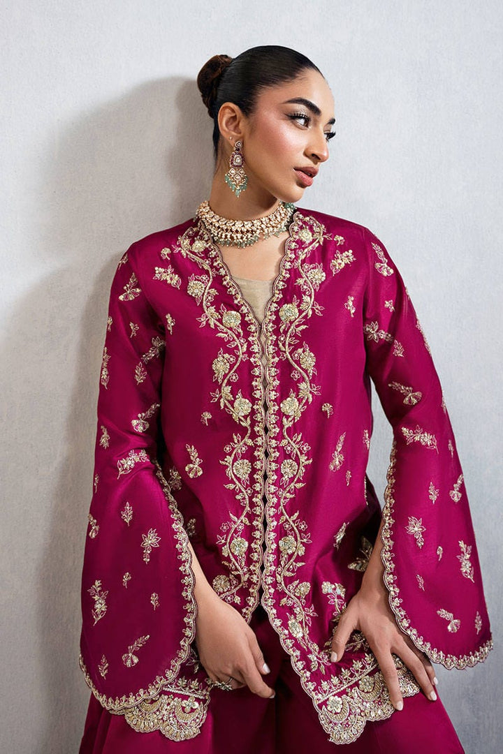 Wine Affair is a versatile short jacket in pure raw silk. The piece is intricately adorned with fine resham embroidery and exquisite hand embellishments, featuring gold kora, dabka, and delicate naqshi work that lend it a regal elegance. The modern slit sleeves add a contemporary fusion edge, making it effortlessly wearable for both traditional and modern festivities. Paired with a metallic gold blouse that adds visual contrast, while the coordinated Dhaka pants, embellished with resham threadwork and gold finishing, tie the entire look together with grace. This ensemble is a perfect choice for intimate weddings, festive soirées, or any special occasion that calls for timeless glamour with a modern twist.