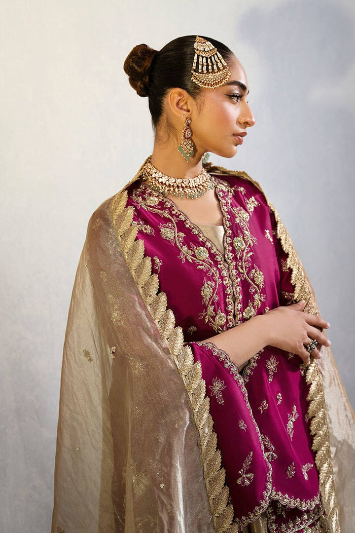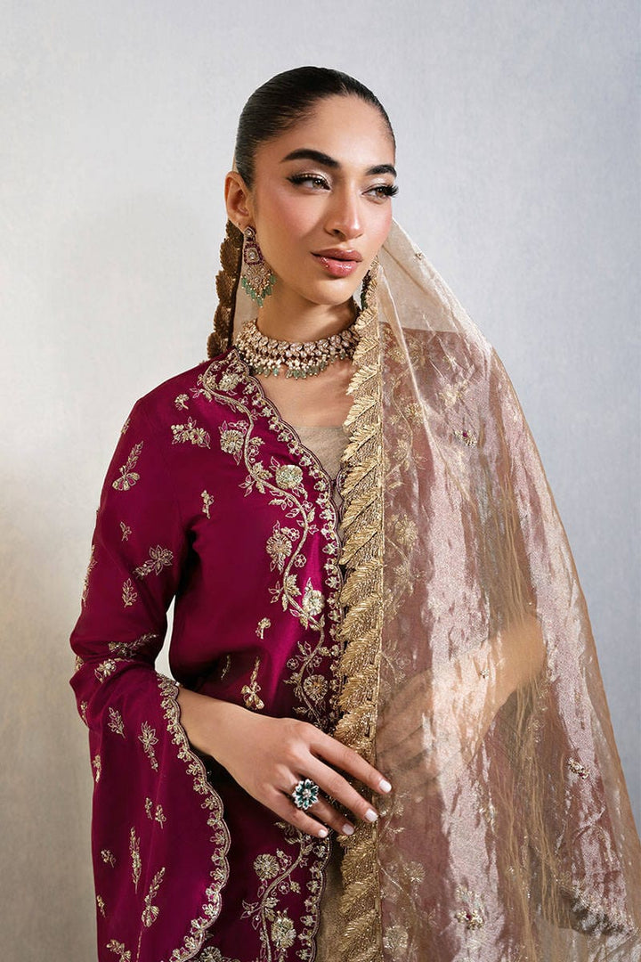 Wine Affair is a versatile short jacket crafted in pure raw silk, richly adorned with intricate resham embroidery and exquisite hand embellishments using gold kora, dabka, and delicate naqshi work that exude regal charm. The modern slit sleeves introduce a fusion twist, making this piece effortlessly suitable for both traditional celebrations and contemporary festivities. Paired with a gold blouse and a pure tissue lehenga, adding depth and a refined elegance—perfect for the modern-day bride seeking timeless glamour with a contemporary edge. The look is completed with a sheer, pure tissue dupatta, delicately finished with sitara chann and hand-embellished borders, adding a final layer of ethereal grace.