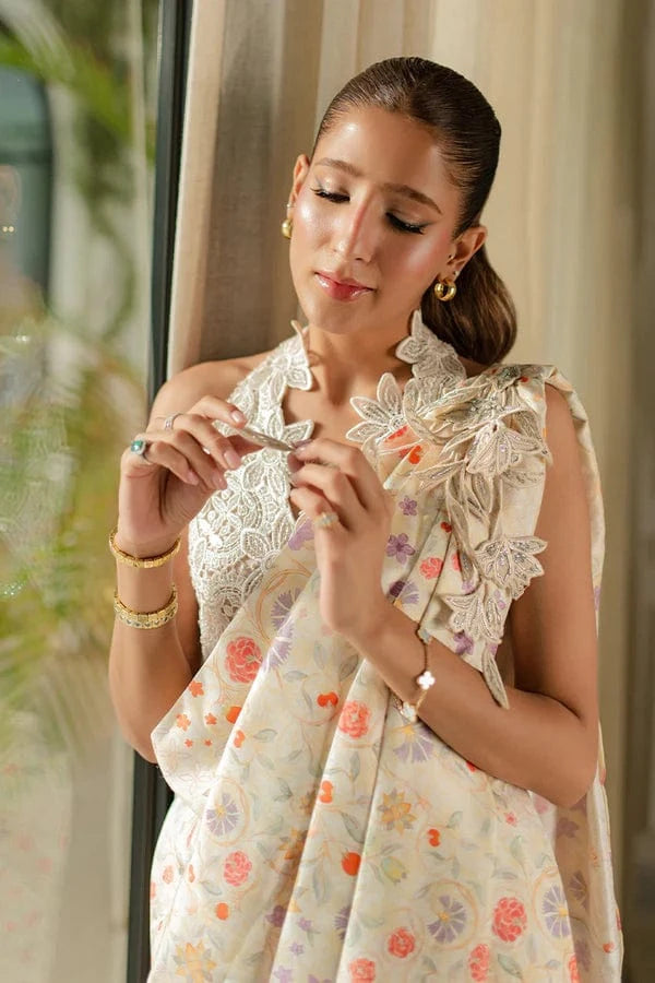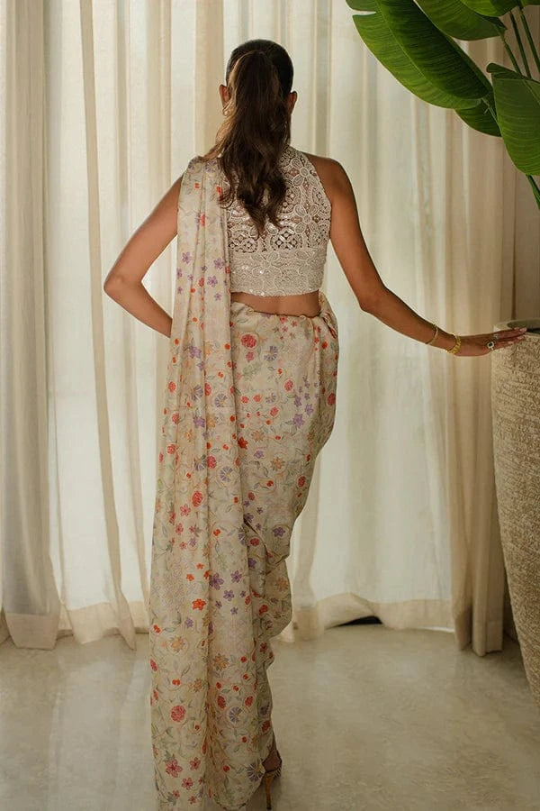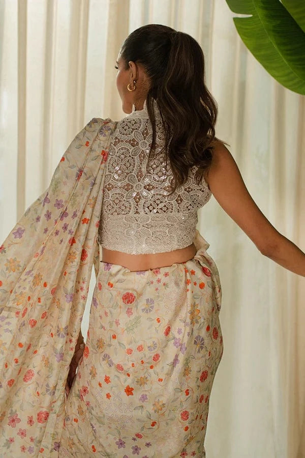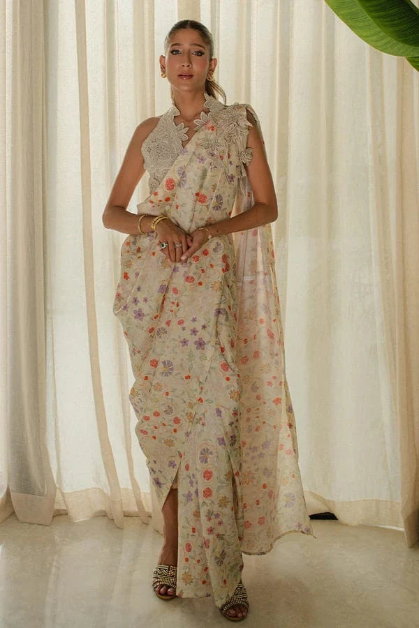 Look ethereal in this gorgeous Signature Print Mina Hasan stitched saree. Featuring blooming florals in pink and blue, this saree features a beautiful lace blouse and a striking silhouette.