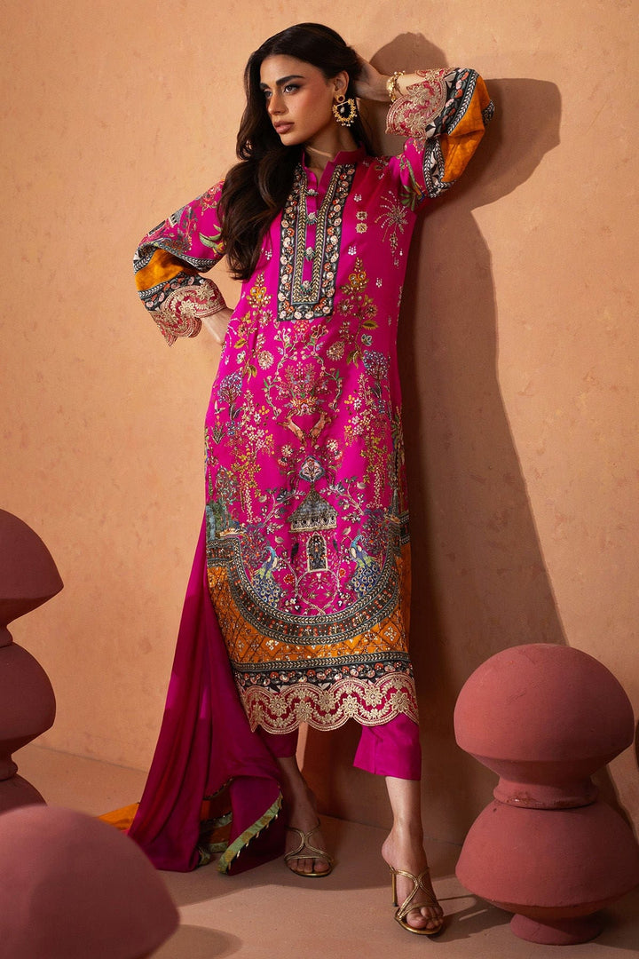 A long silhouette A-line shirt in a striking bubble gum pink and tangy orange color, featuring a floral tapestry on both the center front and back. The printed details are elegantly accentuated with zardozi and hand-embellished elements. The hem is further enhanced with zari appliqué details. The neckline is beautifully embellished with handcrafted dangling accents. This exquisite shirt is accompanied by an ombré silk dupatta and matching straight raw silk pants, creating an ideal festive ensemble.