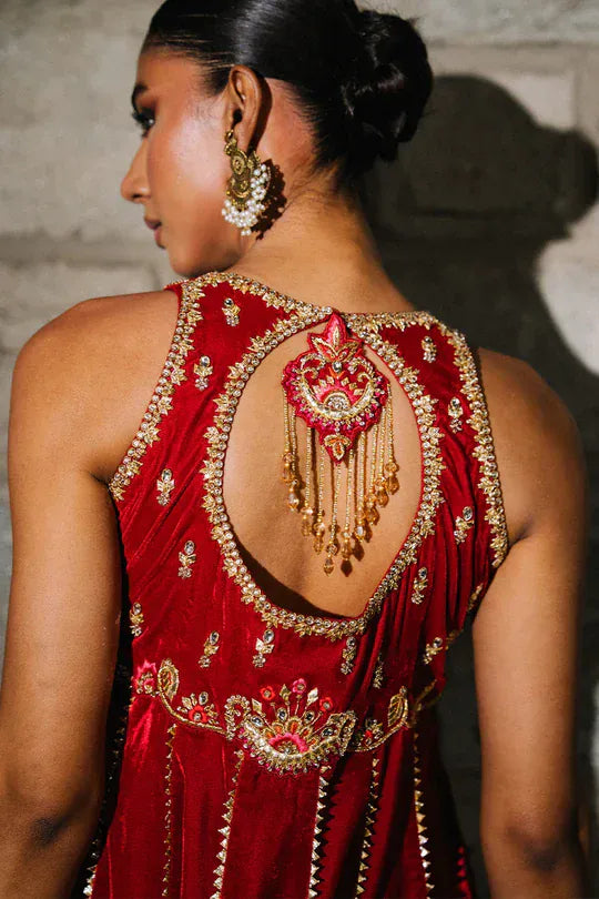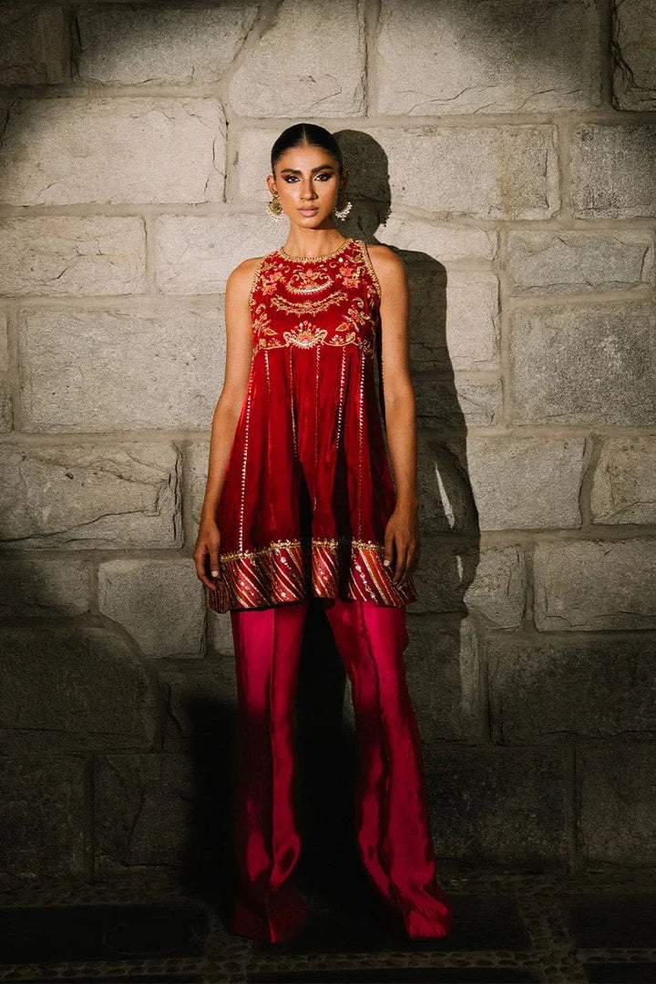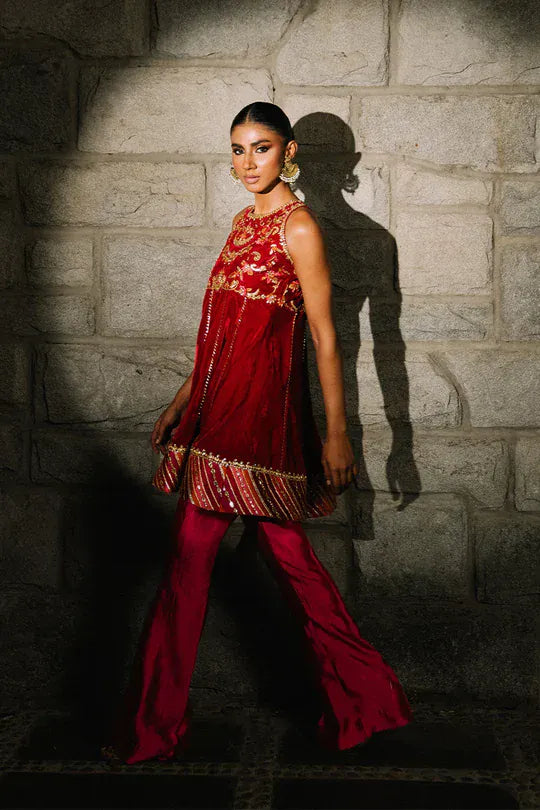 Adorned with gotta work on the yoke and chatta patti along the ghair, this short velvet peplum is cut from a stunning deep red hue! Pair this peplum with a contrasting magenta boot cut pants for a head turning look this winter festive season!