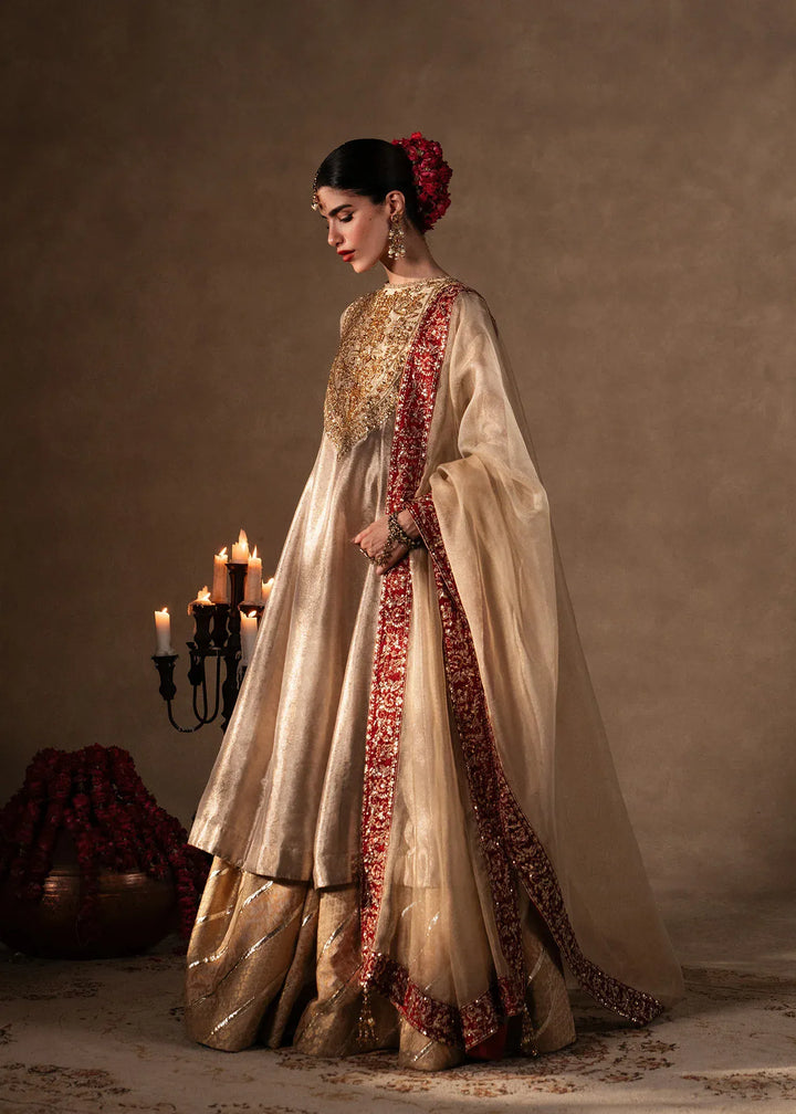 Offering elevated ease and sophistication, this gold tissue panelled peshwas features a heavily worked neckline and a classic chatta patti brocade sharara. Completing the festive look with a gold pure net dupatta framed with a red charmeuse silk border, you can totally style this for an intimate nikkah or bookmark it for the trousseau.