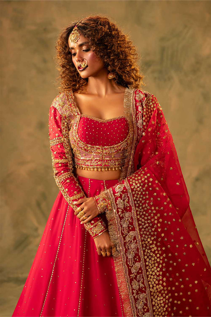 Zeenat is the epitome of heavy formal grandeur, designed in a striking red hue on rich tissue Korean raw silk, a fabric that radiates luxury with its delicate sheen and graceful fall. The lehnga and choli are adorned with masterful handwork, featuring Naqshi, Dabka, Gota, Crystals, Mukesh, and Sequins, creating a breathtaking play of texture and sparkle. The silhouette is regal yet modern, tailored to make you shine on your most special day. Completing the ensemble, the dupatta is lavishly embellished using a modern spray technique, balancing tradition with contemporary artistry. Perfect for mehndi, baraat, or any festive celebration, Zeenat is more than an outfit—it’s a statement of timeless elegance and royal sophistication