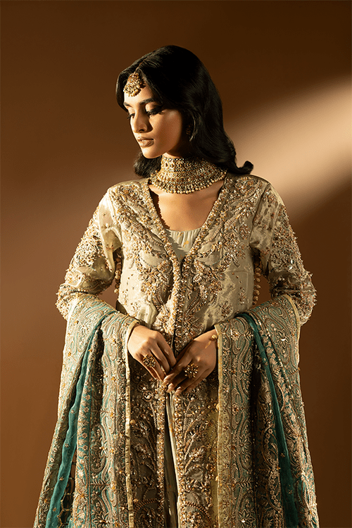 A regal green pure zari tissue shirt paired with a chiffon-printed frock and organza dupatta with heavy embroidered border. This piece shines with hand embroidery including beads, stones, pearls, stars, gota, dabka and naqshi, blending traditional craft with a fresh modern cut.