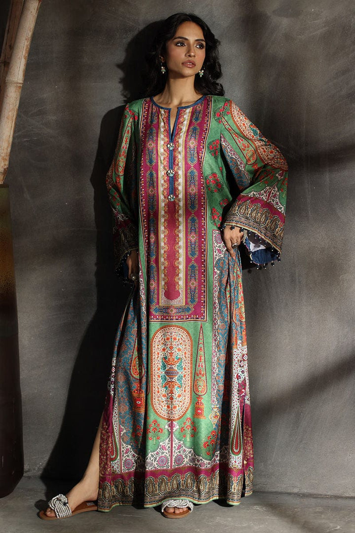 An elegant velvet kaftan designed with multicolored prints and minimal embroidery along the neckline, ideal for refined yet effortless styling.